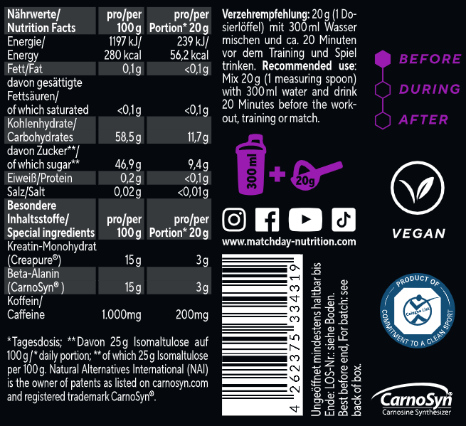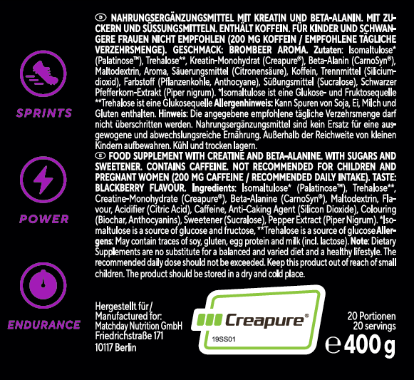 Schluss mit Krämpfen oder vorzeitiger Ermüdung! Wir boosten deine Energie, Schnellkraft und Explosivität über volle 90 Minuten mit der ATP Matrix bestehend aus Isomaltulose, Beta-Alanin und Creapure®!