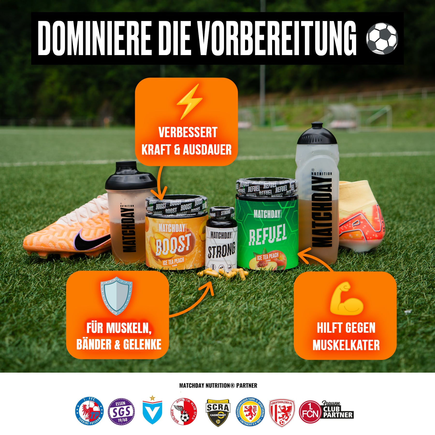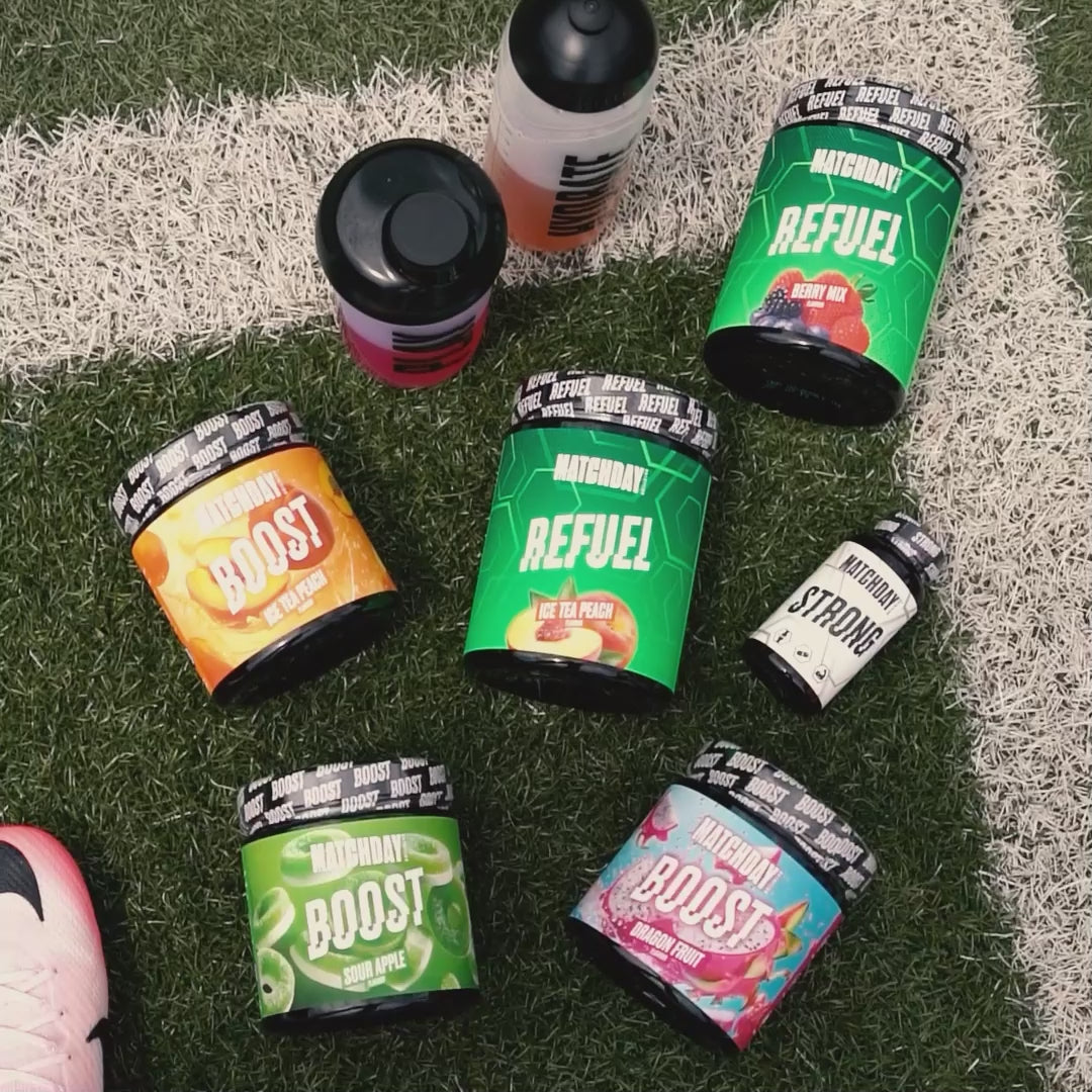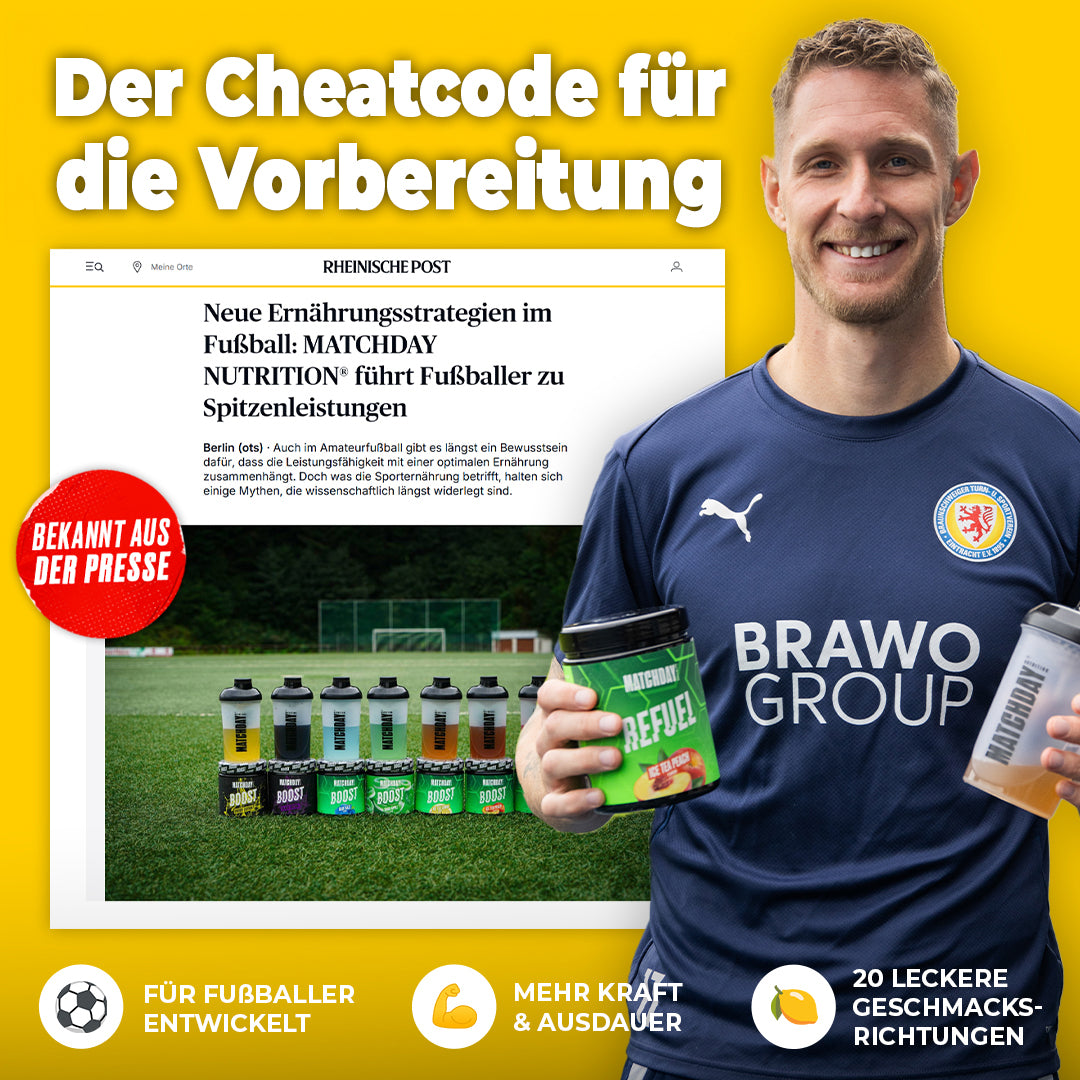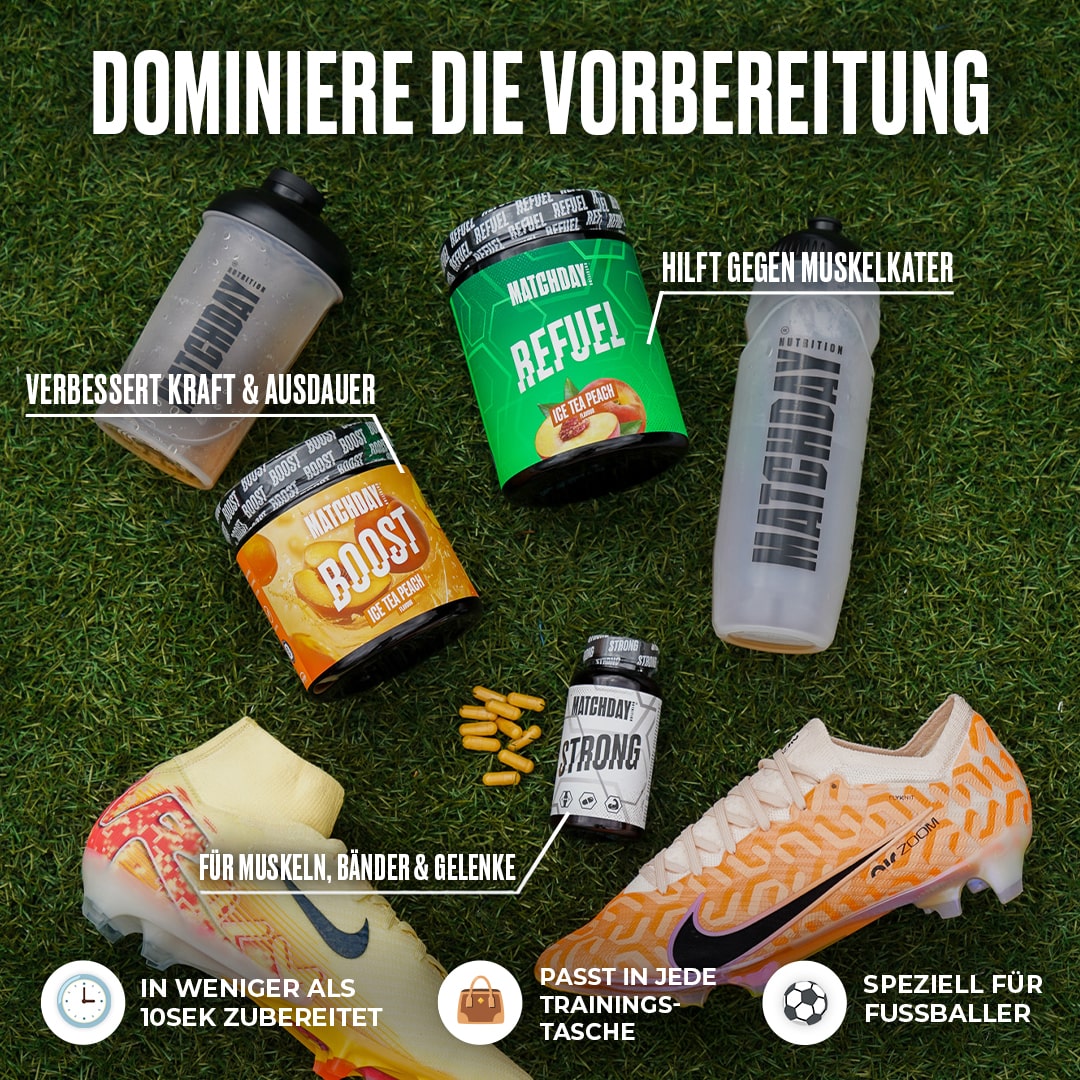Dafür haben wir auf Grundlage neuester wissenschaftlichen Studien für ALLE Phasen des Trainings und Spiels MATCHDAY NUTRITION® entwickelt!