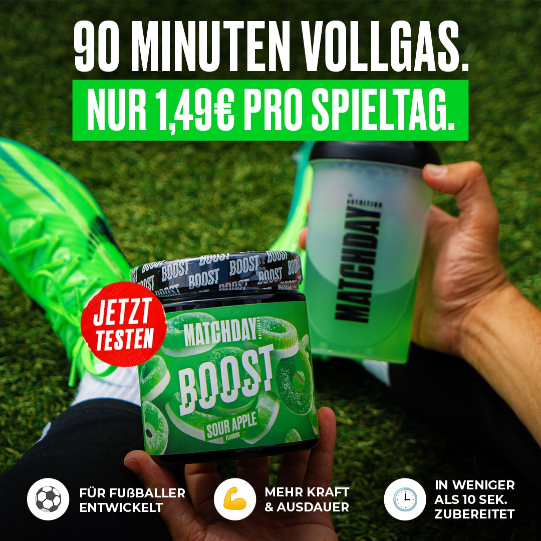 Wir setzen auf die ATP-Boost-Matrix bestehend aus Trehalose, Beta-Alanin und Creapure®. Der Boost lässt deine Muskulatur später ermüden und verbessert den Nährstofftransport. So bist du länger belastbar und hast Kraft für Sprints und Pässe.